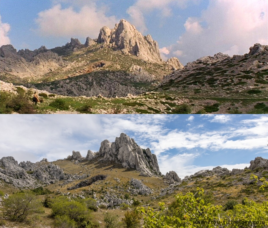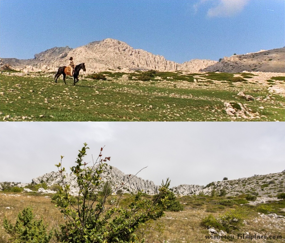 Louka s hroby leží přímo pod kráterem. Stačí sejít skalnatým lesíkem, ve kterém se točily souboje banditů s Apači a jsme na místě.