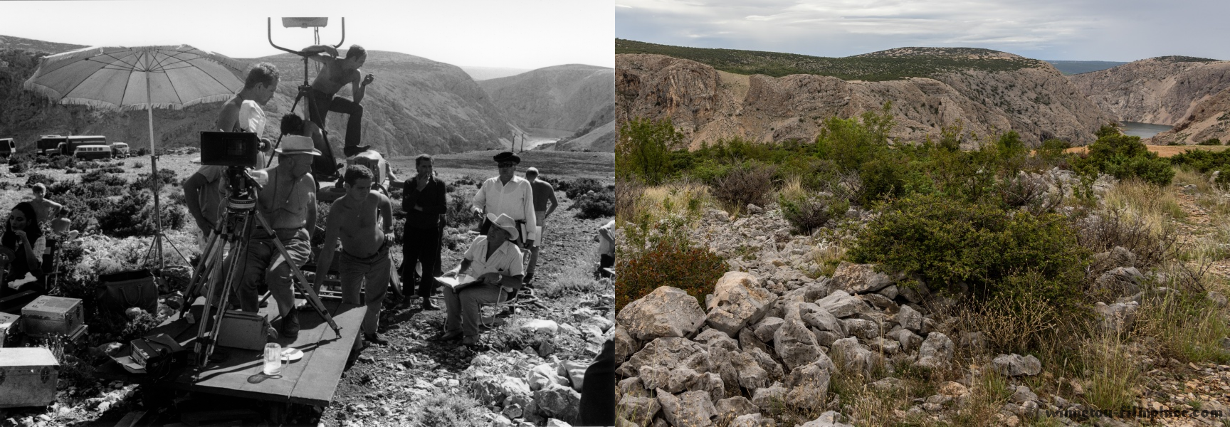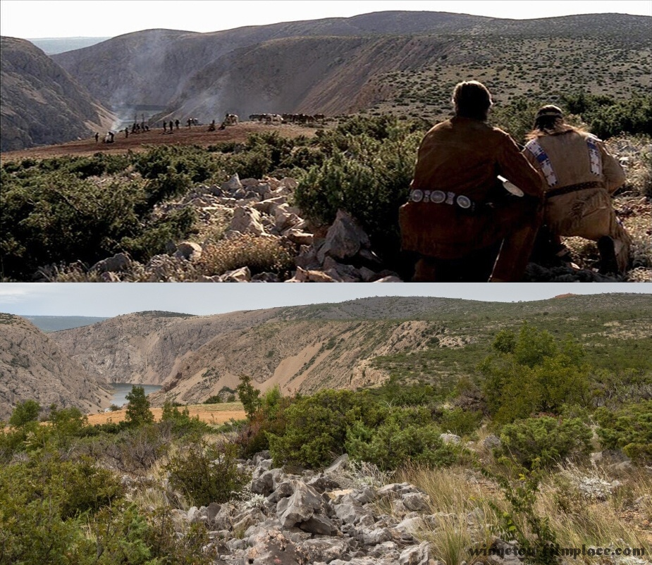 Za ní bude silnice pokračovat jako dlouhá táhlá rovina. Po necelém kilometru přijde nenápadná odbočka (mezi stožárem 86 a 87) vpravo na šotolinovou cestu. Ta vede přímo k místu, kde stálo pueblo Apačů (GPS 44.222757, 15.613875). Kdybychom z hlavní neodbočili, ale pokračovali ještě několik set metrů dále, bude po pravé straně hned vedle silnice stará cesta, na které se natáčely některé jezdecké scény.